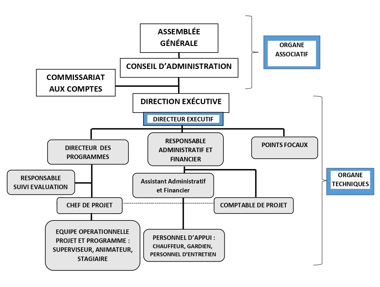 La Direction exécutive est l'organe de gestion et d'administration de l’ONG. Il a pour Mission d'exécuter les décisions de l’Assemblée Générale et du conseil d’administration, de mettre en œuvre les programmes et projets de l’ONG.